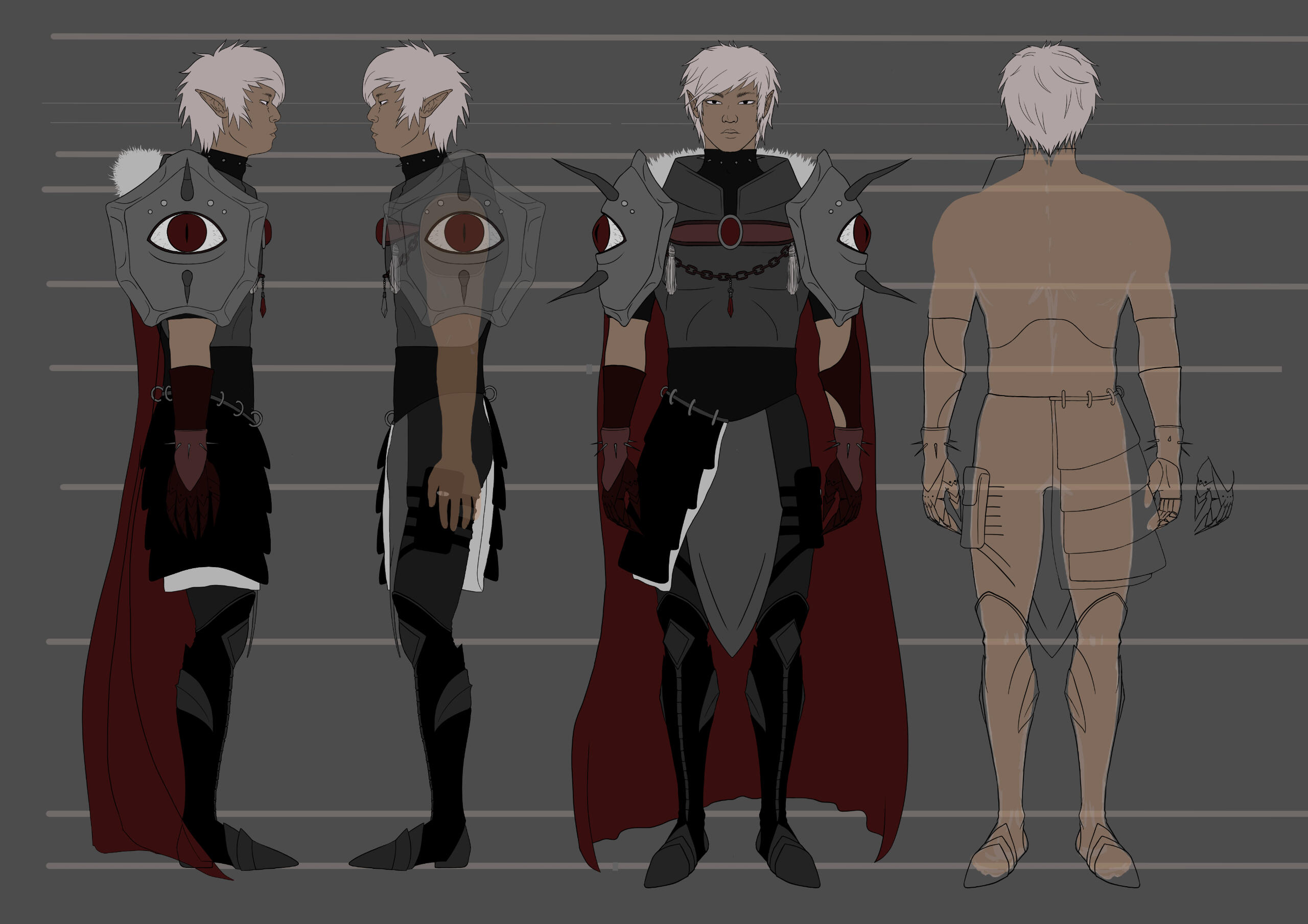 The dark elf - he has no name by now - obtains a magical armor. The gazing armor. The shoulder armor has functioning eyes that protect the person wearing it - ONLY if it recognizes the persons true honest intentions. As a protection mechanism the shoulder armor extends its horns when it sees danger. The whole armor itself can change its shape.